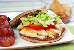 On a microwave-safe plate, spread seasoned beans onto the bottom half of the bun. Evenly top with chicken. Sprinkle chicken with remaining 1/4 tsp. taco seasoning, followed by cheese.