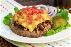 Blot away excess moisture from mushroom caps. Divide beef mixture between the caps, and top each cap with a slice of cheese.