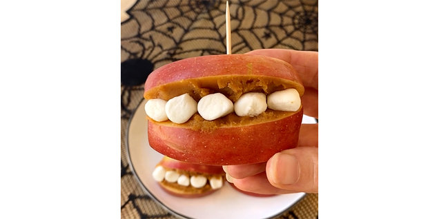 Cut 6 hard-boiled eggs in half. Discard the yolks. Evenly spoon 3/4 cup hummus into egg white halves, about 1 tbsp. each. Cut 6 black olives in half, and cut another 6 olives into strips to form the spider legs. Top each stuffed egg white with an olive half, followed by olive strips to look like a spider. 1/4 of recipe (3 tarantula eggs): 135 calories, 8g total fat.Peanut Butter & Apple Monster Mouths