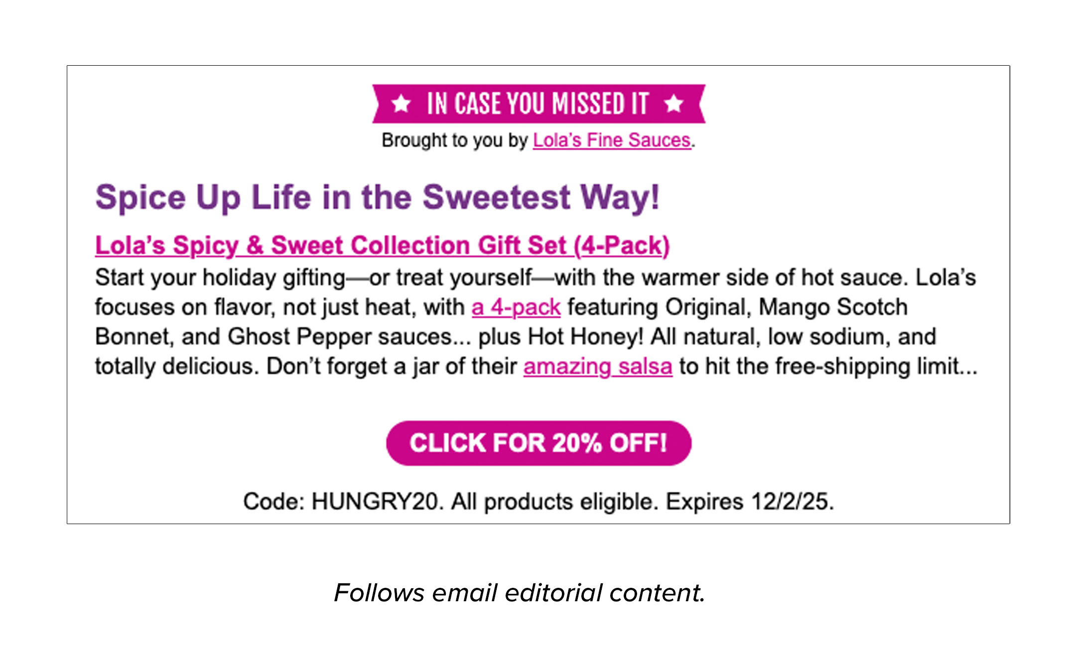 Partners receive high-impact email exposure with custom imagery and native copy designed to drive product discovery and sales. 25% share of voice.In Case You Missed It (Followup Email Sponsorship)